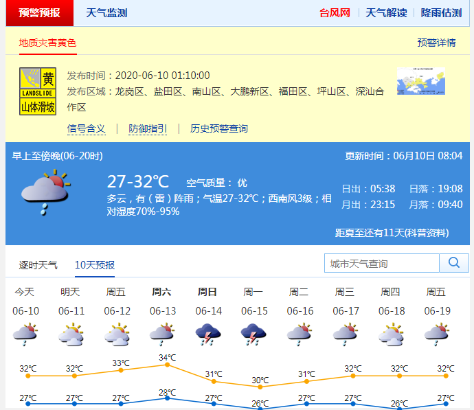 市氣象臺預測,10日我市(含深汕)多云,有短時(雷)陣雨,局部大雨,本輪“龍舟水”過程趨于結(jié)束。11-13日多云,有短時(雷)陣雨,天氣漸趨悶熱。