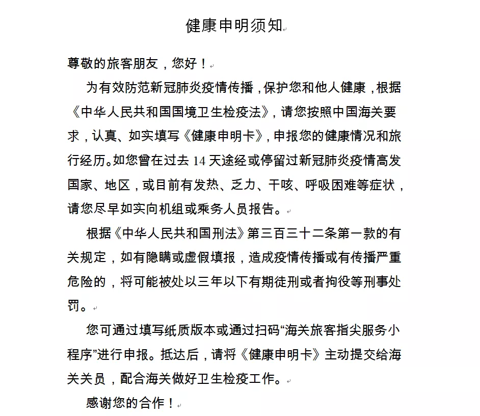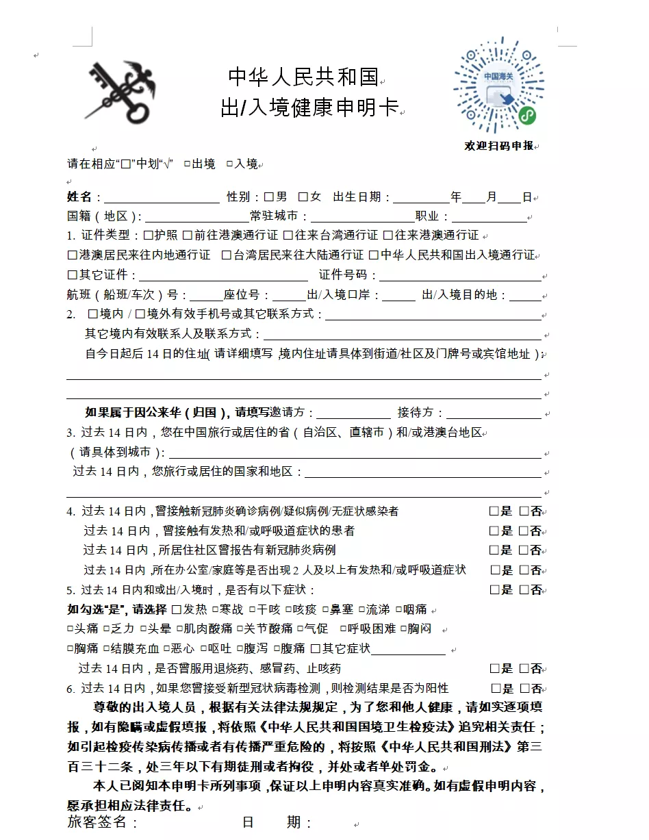 一、請(qǐng)?zhí)崆跋螺d打印《健康申明卡》(見附件1),或關(guān)注“海關(guān)旅客指尖服務(wù)小程序”(見附件2)。提前如實(shí)填寫紙質(zhì)或電子健康申報(bào)信息,通關(guān)時(shí)主動(dòng)向海關(guān)申報(bào)。