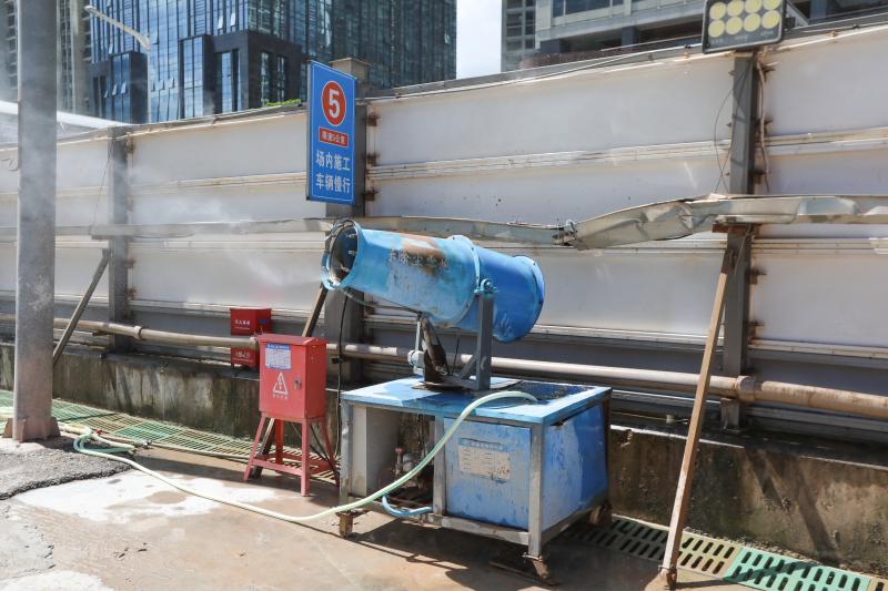 現(xiàn)場設(shè)有霧炮機(jī)濕潤地面,防止起塵(攝影:翁正昊)