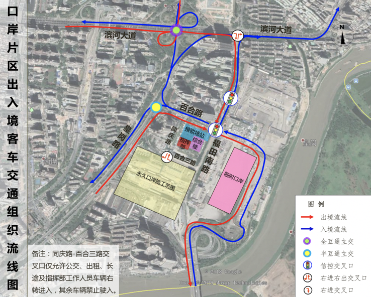 臨時口岸期間機動車交通按照“流線順暢、客貨分離、人車分離”的原則進行組織。主要利用口岸片區(qū)的皇崗路、百合路、福田南路、同慶路等進行組織。各交通方式交通組織流線圖如下: