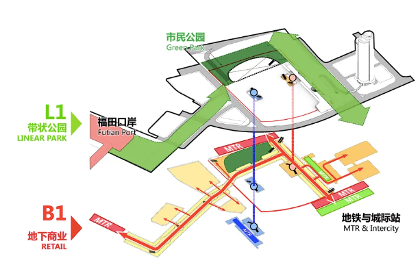 地下一層——軌道換乘:通過“城市通廊”實(shí)現(xiàn)周邊多條軌道站點(diǎn)的高效換乘,并實(shí)現(xiàn)新舊口岸、軌道交通及城市綠軸的高度復(fù)合。
