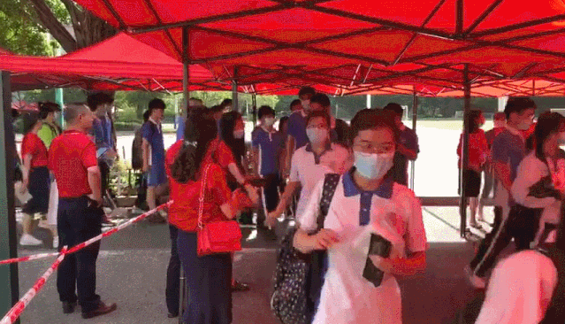 八點十分,學(xué)生走入考場,身穿紅色衣服的老師在兩側(cè)為考生送上祝福?!凹佑?!”“老師我們出發(fā)了?!弊8B暣似鸨朔?。