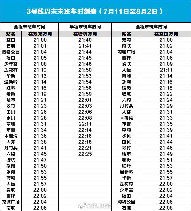 見圳客戶端?深圳新聞網(wǎng)2020年7月8日訊(見圳客戶端、深圳新聞網(wǎng)記者 陳致遠)記者從深圳地鐵了解到,為配合新線開通,7月11日至8月2日的每周六、周日,深圳地鐵3號線將于21時提前結束運營。其他地鐵線路正常運營。