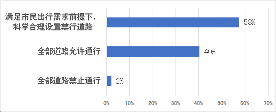 據(jù)調(diào)查,約58%的市民支持在滿足市民出行需求前提下,科學(xué)合理設(shè)置禁行道路;40%的市民認(rèn)為應(yīng)該全部道路允許電動(dòng)二輪車通行;僅2%的市民認(rèn)為電動(dòng)二輪車應(yīng)當(dāng)在全部道路禁止通行。