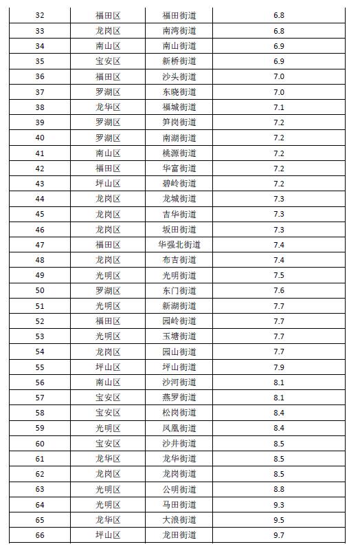 排名前十的街道是:福保街道、福海街道、海山街道、西鄉(xiāng)街道、南園街道、清水河街道、粵海街道、石巖街道、石井街道和蓮花街道;排名倒數(shù)后十的是:觀瀾街道、坪地街道、龍?zhí)锝值馈⒋罄私值?、馬田街道、公明街道、龍崗街道、龍華街道、沙井街道和鳳凰街道。