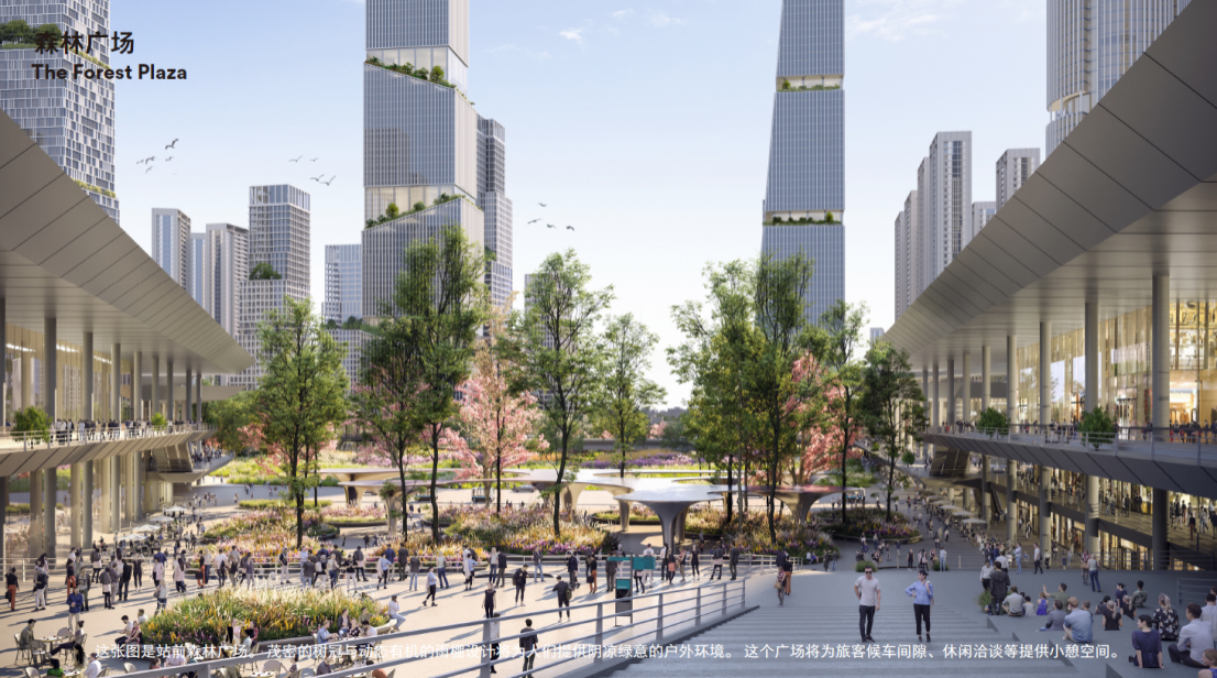 方案以獨(dú)特的“綠鏈都芯”為理念,打造一個(gè)耦合生態(tài)、交通和公共生活的超級(jí)樞紐。設(shè)計(jì)的中央綠芯引入大面積森林和草甸,使人們?cè)诔鞘兄兄赜鲎匀唬尡闭緲屑~地區(qū)既擁有大城市商務(wù)中心區(qū)的特質(zhì),也擁有郊外自然的品質(zhì),形成全新的都市生活體驗(yàn)。同時(shí),中央綠芯還包括會(huì)議論壇、多功能演藝中心等一系列公共服務(wù)設(shè)施,提供面向未來的文化知識(shí)交流服務(wù)。
