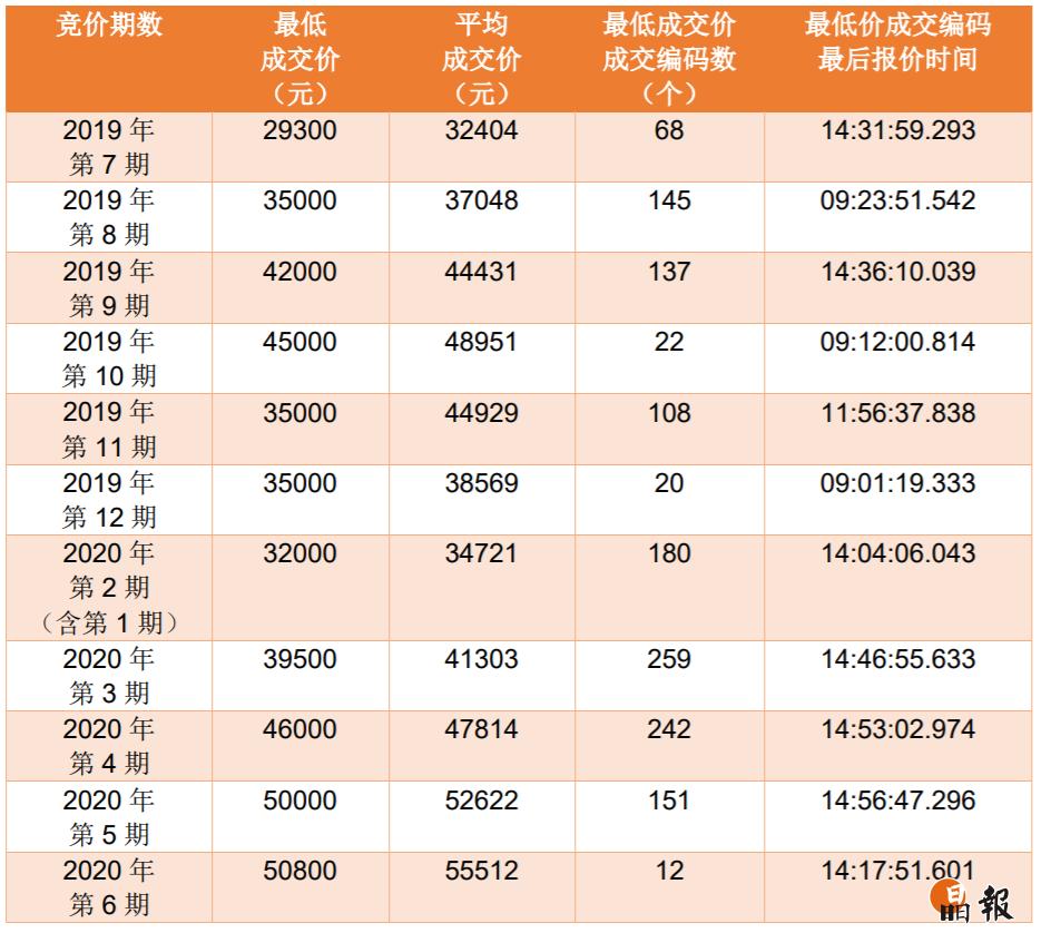 7月15日,2020年第7期普通小汽車增量指標競價公告發(fā)布,本期普通小汽車增量指標共3346個,其中個人指標2945個。競價時間定為7月27日9:00至15:00,連續(xù)進行6個小時,單位和個人在同一時間分別對相應(yīng)增量指標進行競價。此前,第5期、第6期個人最低成交價均破5萬,創(chuàng)近一年新高。