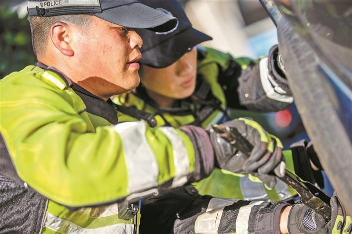 時云財和同事馬上幫助陳先生從車后備箱拿出換胎工具和備胎,在保證安全的前提下,僅用10分鐘就更換好輪胎?!疤兄x你們了,深圳交警‘小黃人’真的是我們最信任的人,有你們在我覺得上路開車就很放心。”陳先生不住地感謝、稱贊交警鐵騎小哥。