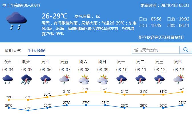 見圳客戶端·深圳新聞網(wǎng)2020年8月4日訊 今年第3號臺風“森拉克”(熱帶風暴級)已于8月2日14時40分前后在越南清化市登陸,并逐漸減弱消失。第4號臺風“黑格比”(熱帶風暴級)趨向華東沿海。據(jù)市氣象臺消息,4日有間歇性陣雨,局部大雨到暴雨,氣溫25-29℃;4日夜間起雨勢加強,5日有暴雨局部大暴雨,陣風6-7級;6日白天起降水逐漸減弱,7-9日漸趨悶熱。