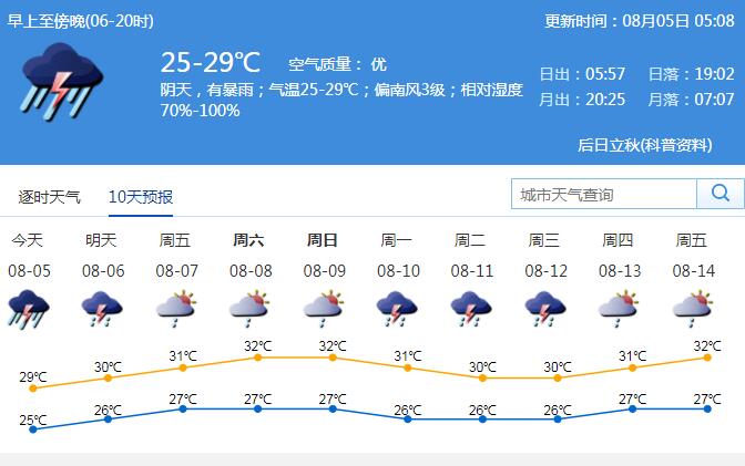 見(jiàn)圳客戶端·深圳新聞網(wǎng)2020年8月5日訊 今日我市陰天,有暴雨;氣溫25-29℃;偏南風(fēng)3級(jí);相對(duì)濕度70%-100%。深圳市氣象臺(tái)于2020年8月5日5時(shí)15分在全市發(fā)布雷電預(yù)警,今天上午海上將不斷有降雨云團(tuán)生成,受其影響我市有零散雷暴;未來(lái)6小時(shí)累計(jì)雨量將達(dá)暴雨,深圳市氣象臺(tái)于2020年8月5日5時(shí)40分在全市發(fā)布暴雨黃色預(yù)警,全市進(jìn)入暴雨戒備狀態(tài),需注意防范。市民停留在安全地方;按照防御預(yù)案停止戶外易燃易爆危險(xiǎn)作業(yè),并加強(qiáng)?;瘓?chǎng)所安全管理。