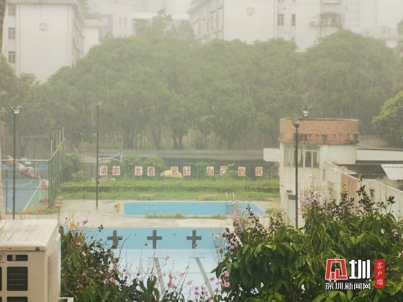 大雨如注,福田區(qū)蓮花北社區(qū)的泳池蒙上一層水霧,看不清楚。(記者張玲 攝)