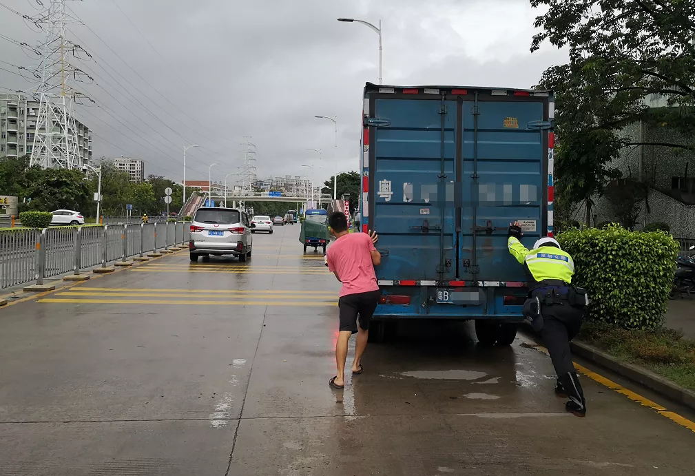 了解情況后,為緩解路面擁堵,避免產生交通事故,鐵騎隊員協助司機把車推到一邊等待救援。