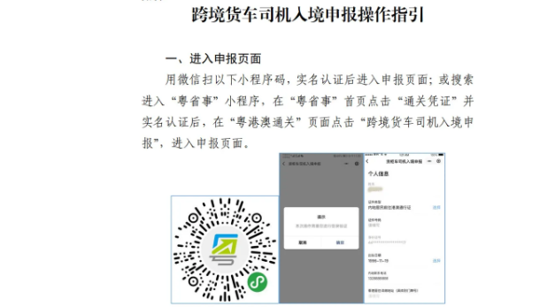 一、跨境司機(jī)入境前應(yīng)在“粵省事”微信小程序(粵省事—粵康碼—粵港澳通關(guān)—跨境貨車(chē)司機(jī)入境申報(bào))中準(zhǔn)確申報(bào)運(yùn)輸作業(yè)任務(wù)相關(guān)信息,包括作業(yè)目的地詳細(xì)信息(工廠(chǎng)/倉(cāng)庫(kù)名稱(chēng)及所在街道)、內(nèi)地手機(jī)號(hào)碼及相關(guān)個(gè)人信息,相關(guān)操作指引詳見(jiàn)附件。入境后所申報(bào)手機(jī)號(hào)碼將會(huì)接收提醒短信。未安裝GPS定位系統(tǒng)和ETC電子不停車(chē)收費(fèi)系統(tǒng)的入境貨車(chē),需按照相關(guān)部門(mén)安排前往指定場(chǎng)地免費(fèi)安裝GPS和ETC系統(tǒng)。