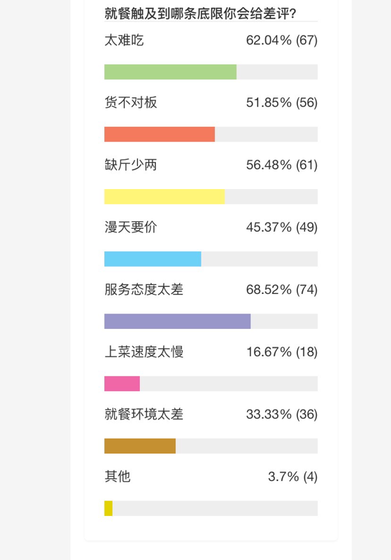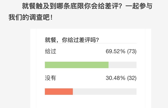 用餐后做出評價,是消費(fèi)者的基本權(quán)利。針對“就餐差評”的問題,深圳新聞網(wǎng)昨天發(fā)起了網(wǎng)友投票。結(jié)果,有69.52%的網(wǎng)友表示,他們曾經(jīng)在用餐后給過差評。在給出差評的原因中,“服務(wù)態(tài)度差”、“太難吃”高居前兩名。對商家提出中肯的批評與監(jiān)督,是每個消費(fèi)者享有的基本權(quán)利,中肯的評價不僅是商家進(jìn)步的動力,也讓更多網(wǎng)友能夠快速篩選定位商家,從而促進(jìn)行業(yè)的良性發(fā)展。