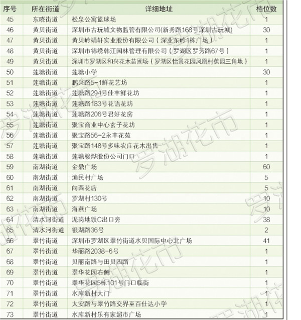 羅湖區(qū)共開(kāi)設(shè)近500個(gè)花市鋪位,遍布全區(qū)10個(gè)街道,近40個(gè)社區(qū)。同時(shí),羅湖區(qū)還特別制作了花市地圖,最大限度的方便市民就近購(gòu)花。