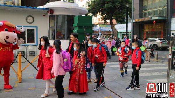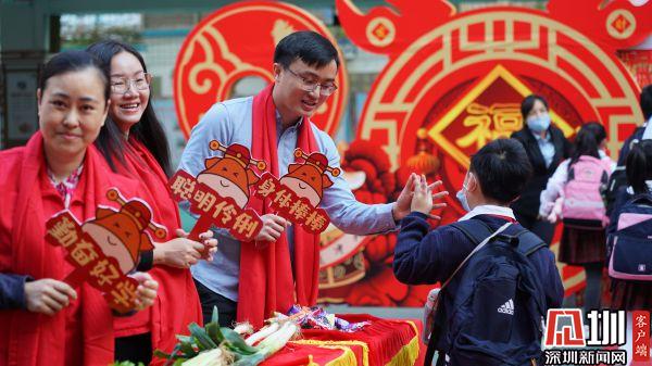 湖貝小學(xué)的老師及家長(zhǎng)代表為學(xué)生送上寓意美好的新春祝福。