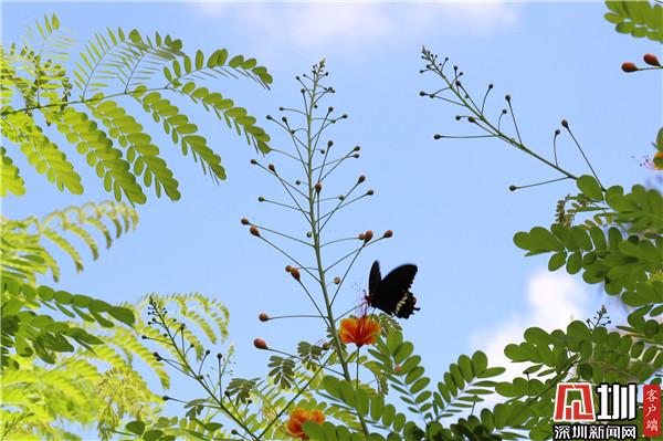 五月綻放全城的鳳凰花,映射著深圳這座城市的繁華與熱情,同時(shí)也給這座城市帶來(lái)勇敢熱烈的色彩。從鏡頭中可見(jiàn),鳳凰花花團(tuán)緊簇,在藍(lán)天的襯托下,那一簇簇火紅的花海張揚(yáng)而又高調(diào)地綻放,為深圳“藍(lán)”染上了一抹紅。