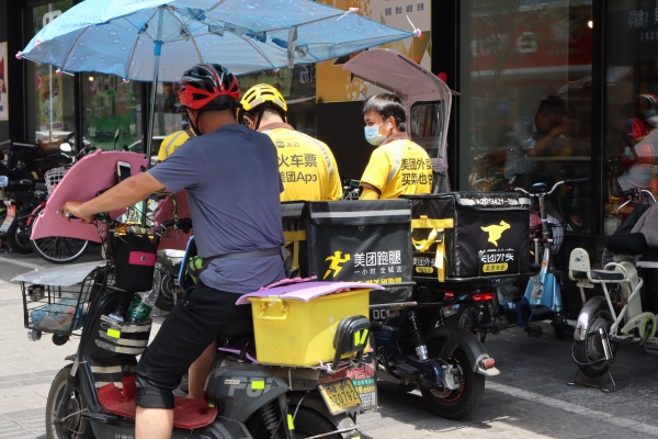 記者看到,街道上像呂先生這樣的外賣員數(shù)量不在少數(shù),短短十幾分鐘,記者就看到了近百名外賣員、派送員穿行街頭,將訂單送達(dá)客戶手中。他們趁取餐時(shí)間,在餐廳門口休息,不少人直接席地而坐,享受一下開(kāi)放餐廳流出的一絲冷氣。