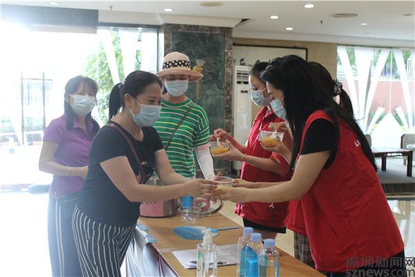 這兩鍋糖水可不一般,是居民賴秀文自掏腰包,買來蓮子、銀耳、木瓜,小火熬制了2個(gè)小時(shí)。當(dāng)天下午,值守在老圍花園C2出入口的義工楊文洪,是一位退伍軍人,前不久剛加入老圍社區(qū)義工隊(duì),聽到疫情防控的召喚,利用休息時(shí)間來到小區(qū)出入口執(zhí)勤,協(xié)助居民進(jìn)行疫苗接種預(yù)約登記,忙得滿頭大汗也顧不上擦。他接過糖水,一口喝完,呵呵笑著說,“來得正是時(shí)候。”喝完,又忙著為進(jìn)門的居民驗(yàn)健康碼。