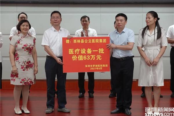 鄉(xiāng)村振興,關(guān)鍵在人,醫(yī)療和教育等基礎(chǔ)設(shè)施同樣起不可或缺的作用。此次考察中,羅湖區(qū)向西林縣人民醫(yī)院捐贈(zèng)了一批醫(yī)療設(shè)備。據(jù)了解,自2017年對(duì)口幫扶西林縣以來(lái),羅湖區(qū)共派出8批醫(yī)療隊(duì)、92人次駐點(diǎn)西林縣各醫(yī)療衛(wèi)生單位,累計(jì)捐贈(zèng)價(jià)值約1000萬(wàn)元的醫(yī)療儀器和設(shè)備,充分保障了地方百姓的醫(yī)療需求,推動(dòng)了西林縣公立醫(yī)院集團(tuán)的發(fā)展。