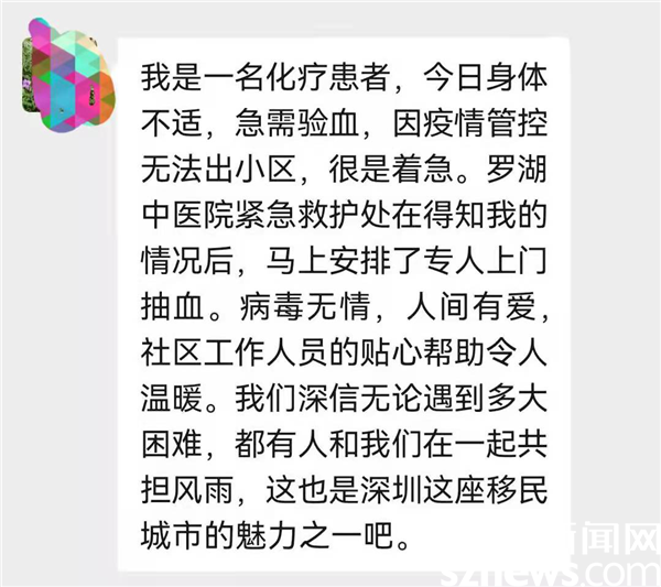 葉先生在護(hù)士為他抽血離開之后,送上了真摯地感謝?!盁o論我們遇到多大的苦難總會(huì)有人和我們一起共擔(dān)風(fēng)雨,這就是深圳的魅力”,葉先生說到。