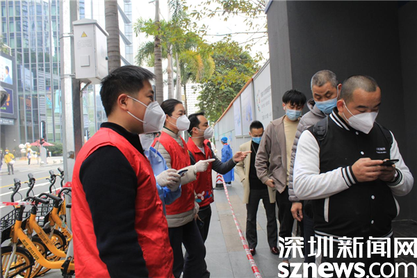 1月14日,深圳市京基智農(nóng)時代股份有限公司總部黨支部黨委副書記張玲帶領(lǐng)5位黨員,火速來到禧程酒店臨時檢測點,經(jīng)過簡短的培訓(xùn),他們集體上崗,各就其位。有的維持秩序,有的在外圍協(xié)助查驗綠碼,有的協(xié)助出示粵酸碼。黃子亮和彭乾偉穿上防護服,現(xiàn)學(xué)現(xiàn)做,使用自己的手機為前來采用的市民掃描粵酸碼。他們都是青壯年,雖然這是關(guān)鍵崗位,但他們一學(xué)就會,很快上手。十人一管,掃碼上傳,有條不紊,忙而不亂。