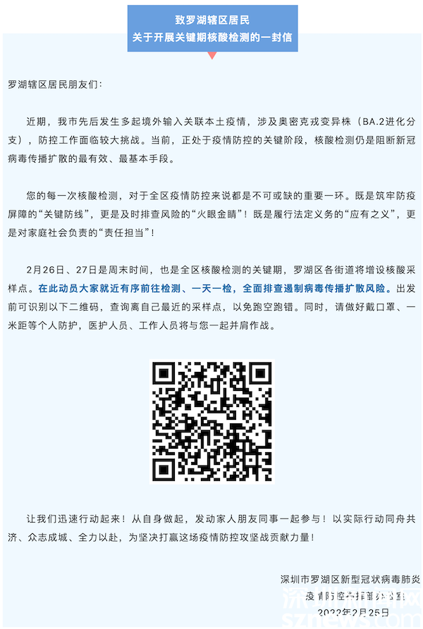 讀特客戶端·深圳新聞網(wǎng)2022年2月26日訊(記者 覃鈺清)2月25日晚,羅湖區(qū)新型冠狀病毒肺炎疫情防控指揮部辦公室發(fā)出《致羅湖轄區(qū)居民關(guān)于開展關(guān)鍵期核酸檢測的一封信》,該信函指出,本周末(2月26日、27日)是全區(qū)核酸檢測的關(guān)鍵期,全區(qū)各街道共設(shè)置200個核酸采樣點,動員轄區(qū)所有居民就近有序前往檢測、一天一檢,全面排查遏制病毒傳播擴散風險。26日上午,記者前往羅湖區(qū)桂園街道實地探訪核酸檢測開展情況。