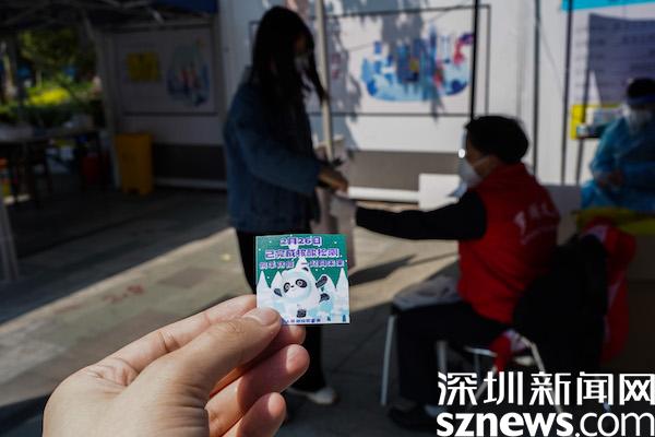 在桂園海翔廣場核酸檢測點,完成檢測后會收到工作人員發(fā)放的印有“冰墩墩”圖畫的當日“已檢”貼紙。