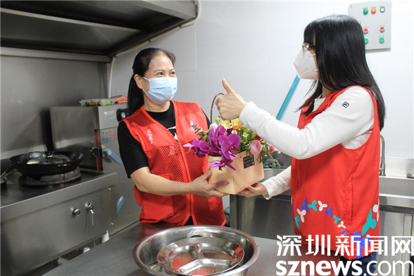 在社區(qū)廚房,老圍社區(qū)居民周文清正在忙碌,疫情開始以來,社區(qū)擔負著下沉人員和醫(yī)務人員的中餐和晚餐,每餐四五十人吃飯,任務繁重,廚師一人根本忙不過來。家住老圍花園的社區(qū)居民賴秀文、周文清得知情況后,立刻趕來幫廚,洗菜、切肉、炒菜、分裝飯盒、搞衛(wèi)生,樣樣都搶著干。羅湖區(qū)最美家庭賴秀文,一連兩個星期在社區(qū)幫廚,發(fā)揮她高超的廚藝,將每一道菜都做得色香味俱全。有了這些熱心居民的協(xié)助,一線人員得以及時吃上熱乎乎的飯菜,保障了防疫工作有序進行。她們用自己的方式參與疫情防控,為社區(qū)安寧貢獻一己之力。