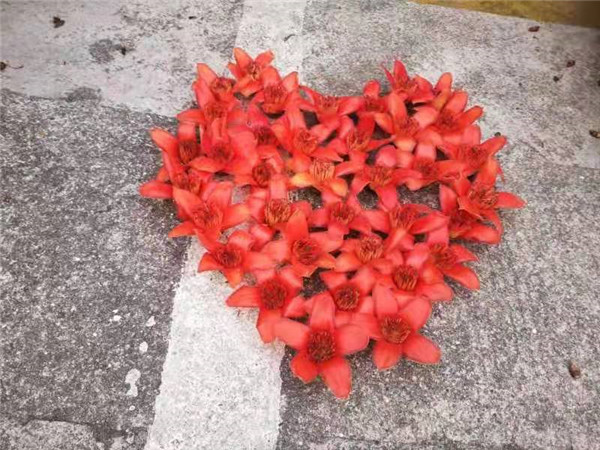 可等到第二次站在樓上時(shí),我大吃一驚……原來,在落英繽紛的路上,出現(xiàn)了幾個(gè)紅色的大字。木棉花平整地躺在地上,花瓣朝向天空,排列成“大白加油”四個(gè)大字!一旁,則是愛心,則是笑臉。那些小孩子開心地站在一邊,臉上滿是燦爛的笑容,好像空中金色的陽光一樣,時(shí)時(shí)閃現(xiàn)在我心頭……