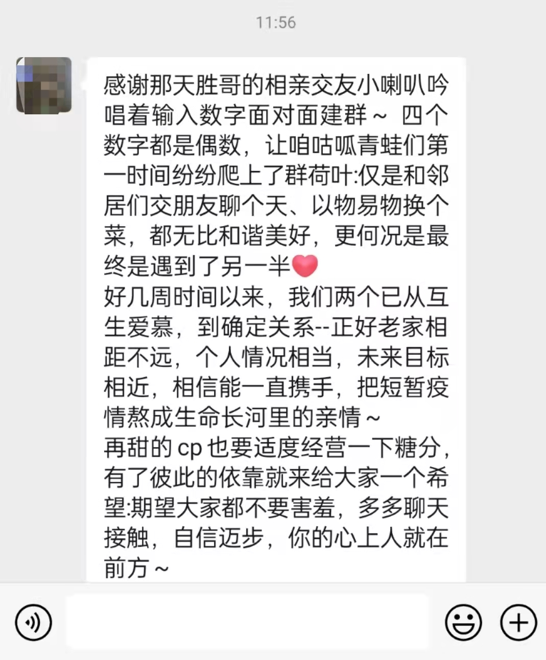 讀特客戶端·深圳新聞網(wǎng)2022年3月22日訊(記者 梁榆其 馮牧原 見習(xí)記者 林楚楚)前段時間,一段防疫人員手持喇叭播放面對面組建單身交友群的視頻火遍全網(wǎng)。3月22日,群主王勝告訴記者,目前在組建的10個隔離不隔愛單身群中已成功誕生了5對情侶。