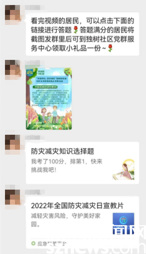 “原來,用滅火器滅火時,滅火器的噴射口應該對準火焰的根部”“電腦著火了,應立即拔掉電源后用濕棉被蓋住電腦,而不是給電腦澆水”“震級相差一級,釋放能量相差約32倍”......微信群里,居民群眾一邊觀看學習視頻,一邊積極分享學習心得、開展熱烈討論。當日,社區(qū)居民李女士連續(xù)作答兩次,均未獲得滿分,不由得感嘆:“這些內(nèi)容看似了解,實操起來還是有點分不清楚,通過學習和答題,重新認識了防災減災的重要性,增長了防災減災知識。”