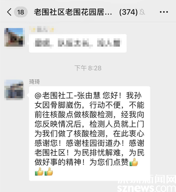 讀特客戶端·深圳新聞網(wǎng)2022年7月14日訊(記者 劉嘉敏 通訊員 楊紀(jì)歐)7月12日晚上8點多,羅湖區(qū)桂園街道老圍社區(qū)的居民琦琦在居民微信群里向社工張由慧說:“您好!我孫女因骨腳崴傷,行動不便,不能前往核酸點做核酸檢測,經(jīng)我向您反映情況后,檢測人員就上門為我們做了核酸檢測,在此衷心感謝您!感謝桂園街道辦!感謝老圍社區(qū)!為民排憂解難,為民做好事的精神!為你們點贊。”