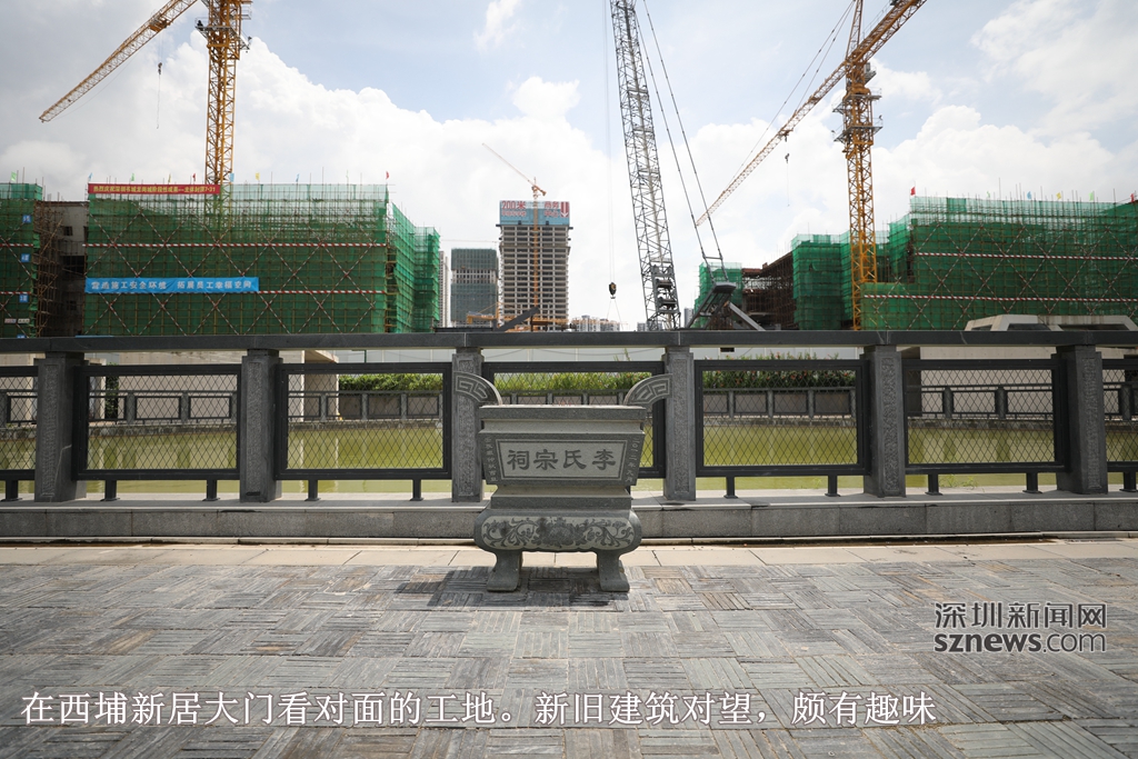 我們到訪西埔新居的時(shí)候,周邊的工地正如火如荼開工,運(yùn)送建筑材料的貨車從西埔新居一側(cè)的通道進(jìn)進(jìn)出出,站在圍屋前的半月形池塘,就可看到高大的吊車和迅速長(zhǎng)高的現(xiàn)代樓宇,村里安靜,村外喧囂,兩個(gè)世界。