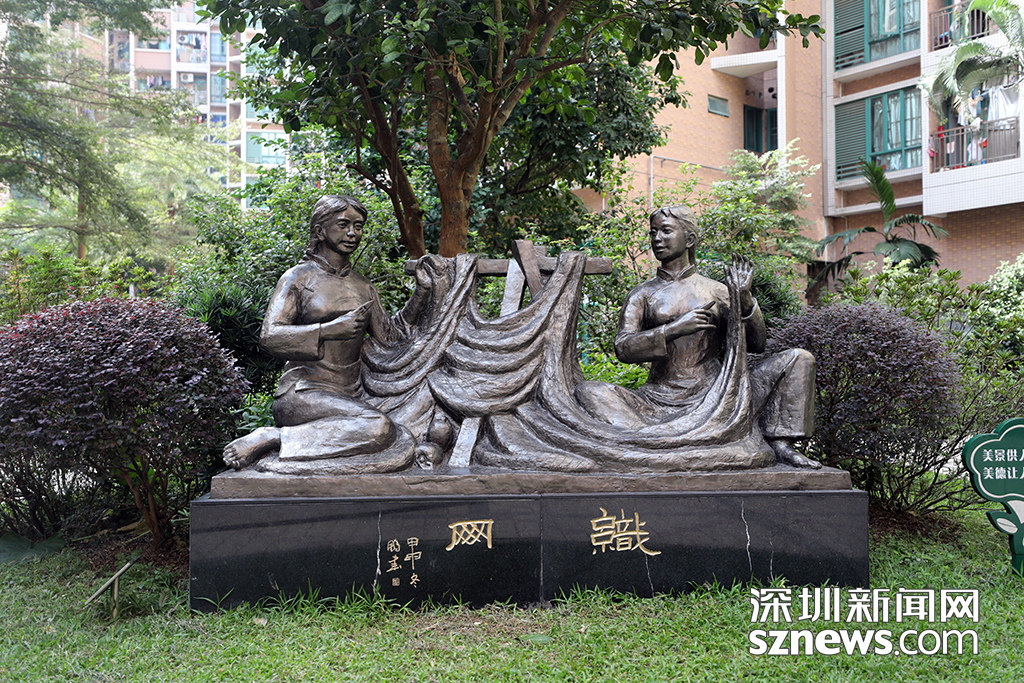 位于社區(qū)內(nèi)的“織網(wǎng)”銅塑展示著漁民村改革開(kāi)放前村民的生活日常