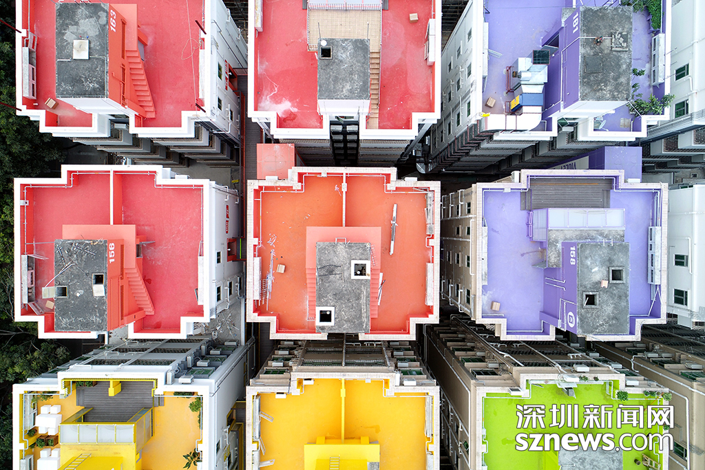 從高空俯瞰,除了能看到色彩繽紛的屋頂,也能看到握手樓之間緊湊的縫隙