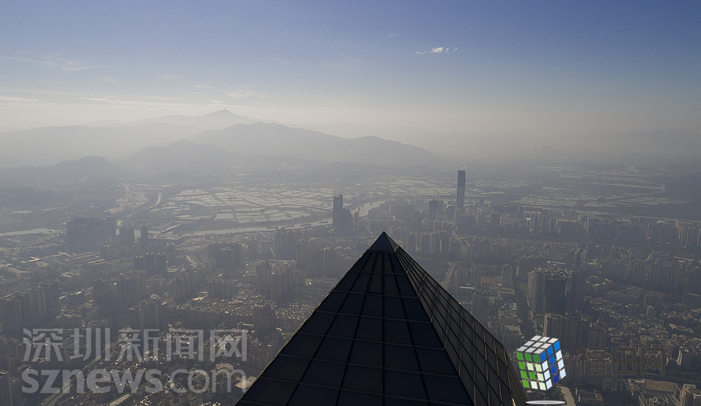 1月18日上午,記者操控?zé)o人機(jī)俯瞰深圳中心區(qū)發(fā)現(xiàn),灰霾將天空“割裂”成一道涇渭分明的界線,把城市籠罩得如同一個(gè)充滿霧靄的森林。從平安金融大廈的上空遠(yuǎn)眺,西南面的深圳灣在灰霾的籠罩下變成了一片“沙漠”,東面的京基一百幾乎被灰霾“吞沒(méi)”,北邊平時(shí)肉眼可看的梅林山也因?yàn)槟芤?jiàn)度較低變得若隱若現(xiàn),南面的米埔濕地也被云遮霧繞。