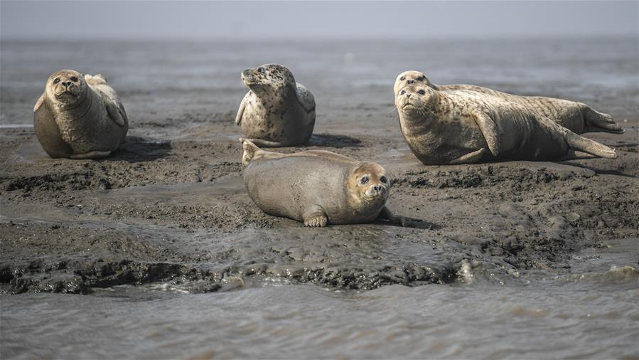 3月25日,幾只斑海豹在遼寧盤(pán)錦雙臺(tái)河口三道溝海域的灘涂上休息。新華社記者潘昱龍攝