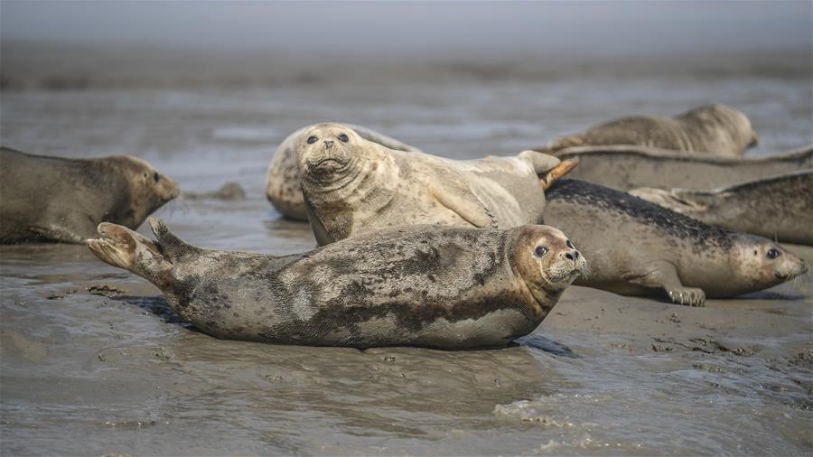3月25日,一群斑海豹在遼寧盤錦雙臺(tái)河口三道溝海域的灘涂上休息。新華社記者潘昱龍攝