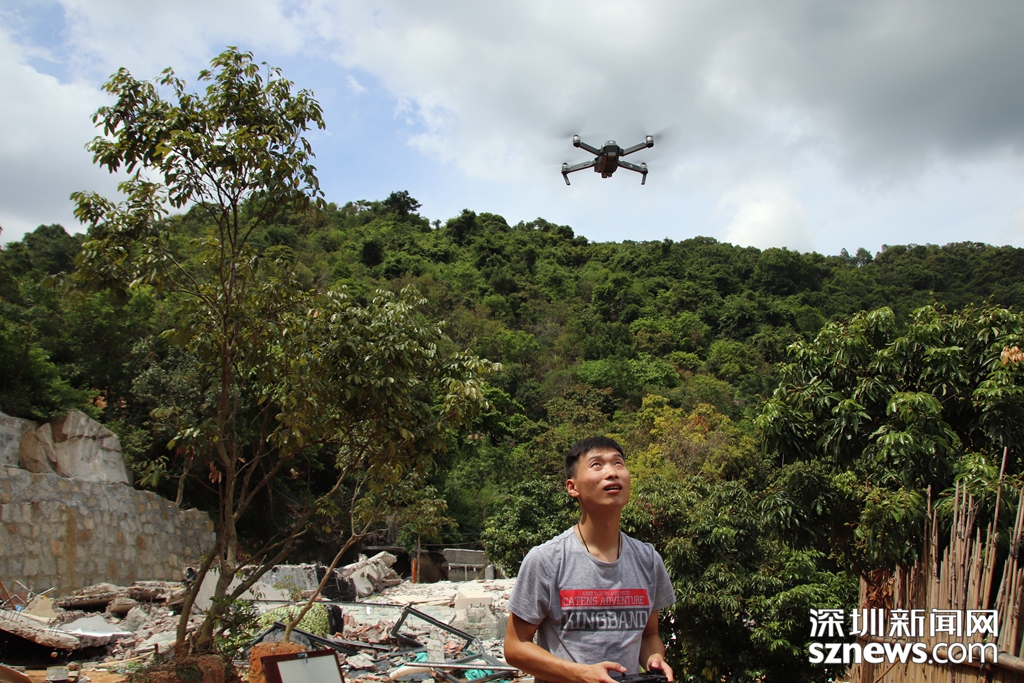 深圳新聞網(wǎng)記者正在操作無人機(jī)對(duì)羊臺(tái)山兩棟拆除后的違法建筑廢墟進(jìn)行拍攝