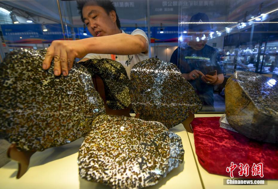 6月15日,第十一屆新疆觀賞石、和田玉精品博覽會(huì)在位于新疆烏魯木齊市紅光山的新疆國際會(huì)展中心開幕,本次博覽會(huì)參展種類涵蓋珠寶、玉石、礦石、隕石、觀賞石等,吸引眾多奇石玩家到場“以石會(huì)友”,打造獨(dú)具特色的“品石”盛宴。圖為一展位前的橄欖隕石切片吸引隕石收藏者。中新社記者劉新 攝