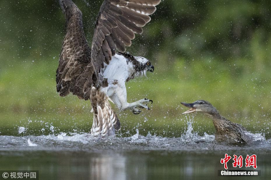 2018年6月21日訊(具體拍攝時間不詳),英國蘇格蘭高地,一只憤怒的綠頭鴨襲擊一只捕食的魚鷹。攝影師Andy Howard對于當(dāng)時眼前的景象感到十分震驚,并用鏡頭記錄下來了整個打斗過程。母鴨最后跳到魚鷹背上,害得魚鷹不得不丟下到手的鱒魚落荒而逃。他表示,沒有發(fā)現(xiàn)任何明顯的原因會引發(fā)這場打斗,母鴨并沒有幼崽需要保護,而魚鷹也不吃鴨子?!盀榱粟s在晨光出現(xiàn)時拍照片,我必須凌晨2點鐘就起床,但我當(dāng)時并不知道有這么精彩的一出戲在等著我?!?圖片來源:視覺中國