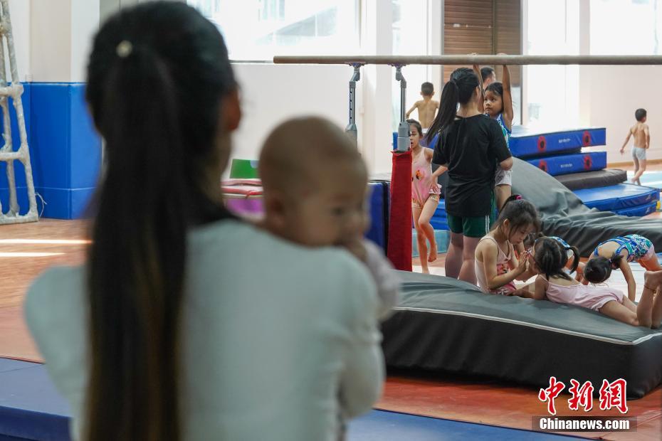 7月16日,貴州榕江,一位母親抱著孩子在訓(xùn)練室門外看著孩子們訓(xùn)練。位于月亮山深處的貴州省黔東南苗族侗族自治州榕江縣,數(shù)十年來堅(jiān)持少年兒童體操培養(yǎng)、訓(xùn)練,對(duì)于全縣有良好身體條件的少年兒童進(jìn)行免費(fèi)集中培訓(xùn)。目前該縣每年有60余名兒童在業(yè)余體操運(yùn)動(dòng)學(xué)校進(jìn)行訓(xùn)練。炎炎夏日,孩子們不懼酷暑,刻苦訓(xùn)練追尋著自己的“體操夢(mèng)”。據(jù)了解,自1972年以來,榕江縣先后向貴州省體操隊(duì)、蹦床隊(duì)輸送了21名運(yùn)動(dòng)員;其中有6名運(yùn)動(dòng)員進(jìn)入國(guó)家體操隊(duì),10名運(yùn)動(dòng)員榮獲“國(guó)家健將級(jí)運(yùn)動(dòng)員”稱號(hào),5名運(yùn)動(dòng)員榮獲“國(guó)際健將級(jí)運(yùn)動(dòng)員”稱號(hào),其中體操名將劉榕冰是2014年體操世錦賽男團(tuán)冠軍成員之一。2004年,榕江縣被貴州省體育局授予“貴州體操之鄉(xiāng)”稱號(hào)。中新社記者賀俊怡 攝