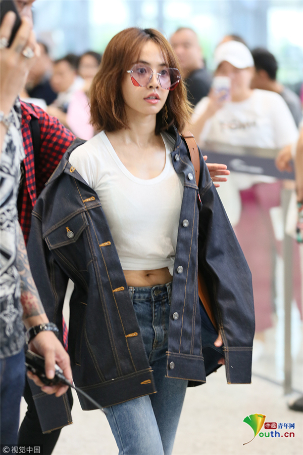 8月7日,廣東省廣州市,蔡依林現(xiàn)身廣州白云機(jī)場,半披牛仔外套的她內(nèi)搭白色緊身衣,小露腹部,下身穿拖地闊腿牛仔褲,一路引來頻頻側(cè)目。