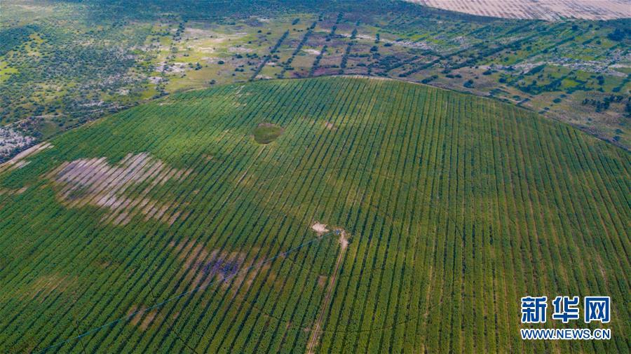 內(nèi)蒙古杭錦旗沙日召嘎查牧民白音道爾計種植的甘草等沙生植物(7月31日無人機拍攝)。 新華社記者劉磊攝
