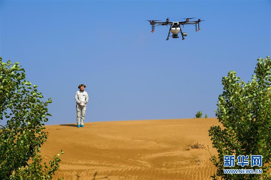 在內(nèi)蒙古鄂爾多斯市杭錦旗的庫布其沙漠中,技術(shù)人員操控無人機飛播造林(7月11日攝)。 巍巍陰山南麓,鄂爾多斯高原之北,橫臥著一條長約400公里、寬5-65公里的黃色“長龍”。它似弓弦,將滔滔黃河拉出一個大大的“幾”字彎。 這是中國第七大、也是距北京最近的沙漠——庫布其沙漠,曾經(jīng)寸草不生,風沙肆虐,被稱為“死亡之?!?。 幾十年來,庫布其人一代接著一代干,書寫了一部荒漠化治理的英雄史詩。 新華社記者 彭源 攝