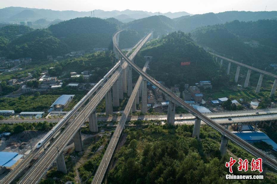 5月16日,航拍貴陽市郊交織的五條高鐵線路,一列動車駛出隧道。貴州省地處中國西南腹地,高原山地居多,因此高鐵建設(shè)的橋隧占比較高。在貴陽市烏當(dāng)區(qū)新添寨,高鐵滬昆線、貴廣客運專線、貴開城際客運專線的隧道和橋梁交織在一起,形成“五洞五橋”并行。中新社記者賀俊怡 攝