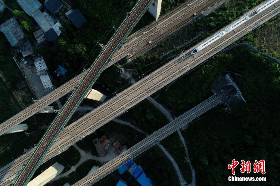 5月16日,航拍貴陽市郊交織的五條高鐵線路,一列動車駛出隧道。貴州省地處中國西南腹地,高原山地居多,因此高鐵建設(shè)的橋隧占比較高。在貴陽市烏當區(qū)新添寨,高鐵滬昆線、貴廣客運專線、貴開城際客運專線的隧道和橋梁交織在一起,形成“五洞五橋”并行。中新社記者賀俊怡 攝