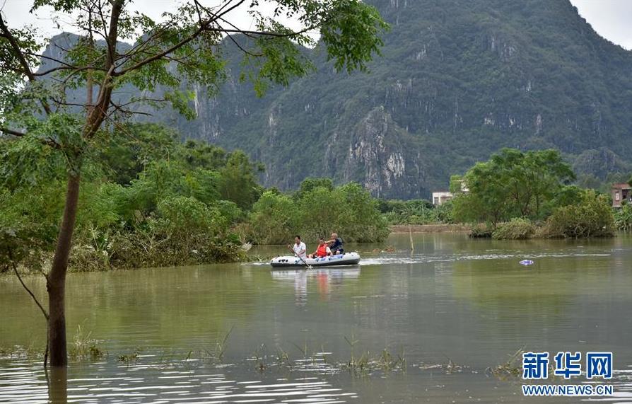 9月18日,廣東省陽江市陽春市陂面鎮(zhèn)政府工作人員在潭潦村被淹的農田上查看水情。