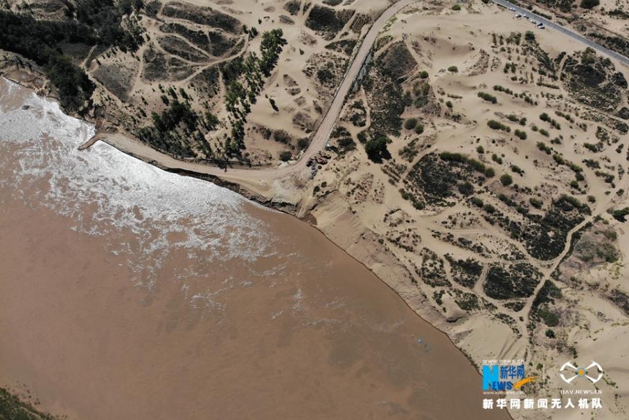航拍黃河托克托段兩岸風(fēng)光,西案的灘涂與沙漠相連。新華網(wǎng) 張偉 攝